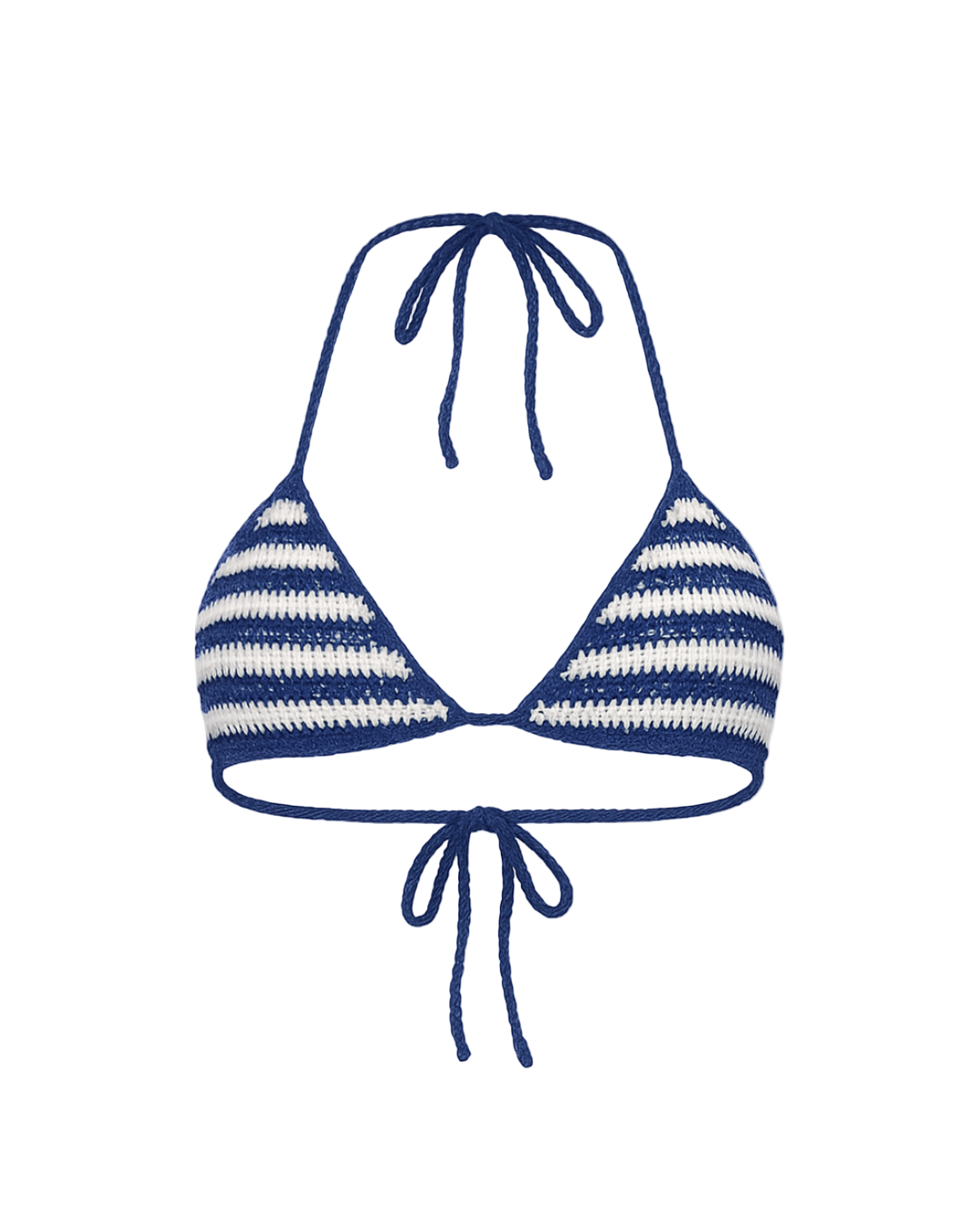 Handmade navy and white striped crochet triangle bikini top with sequins sewn in. Adjustable straps around the neck and around the back. Runs true to size.